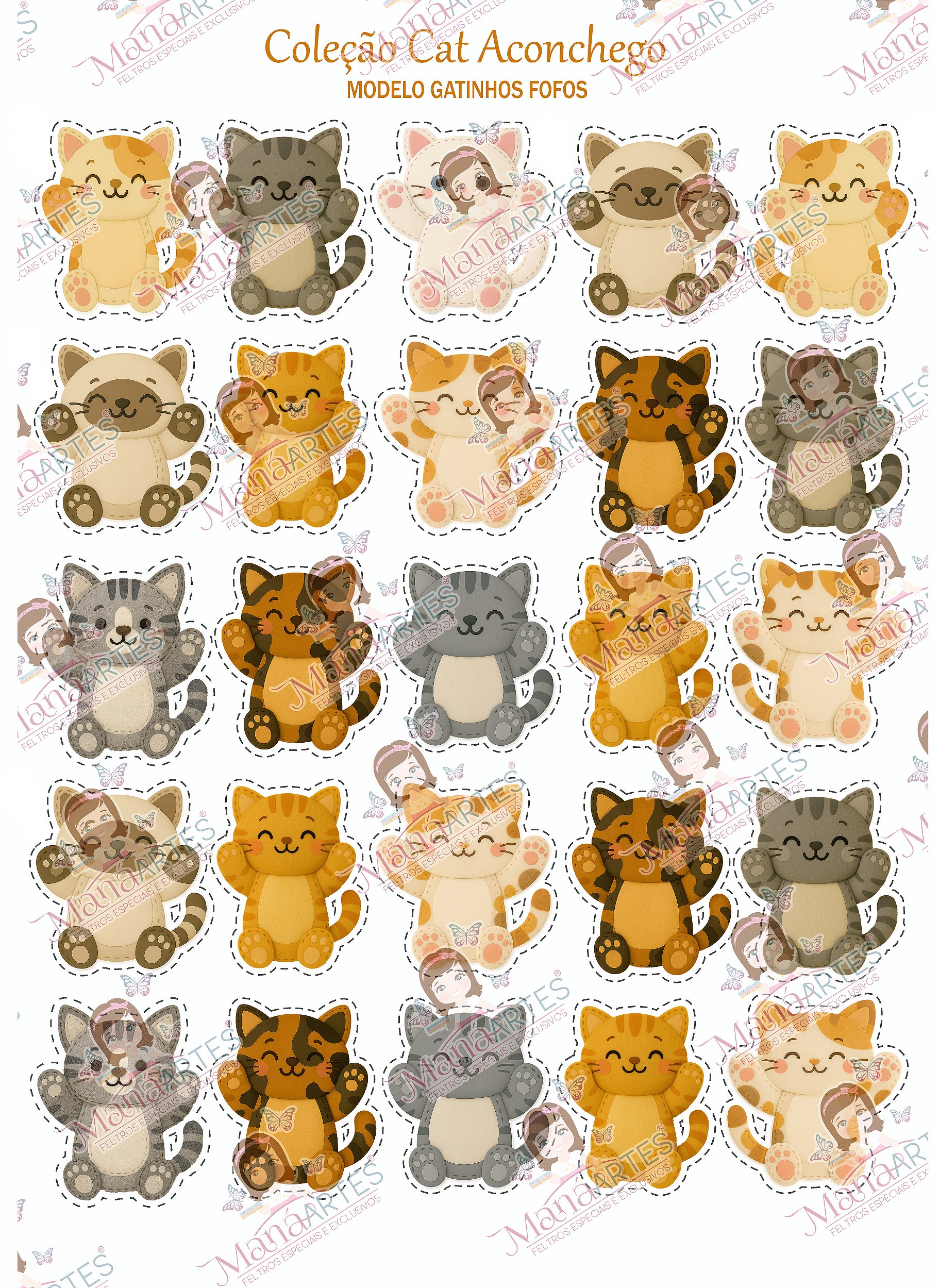 Coleção de gatinhos coordenados, cada um com contorno próprio para recortar limpo.
