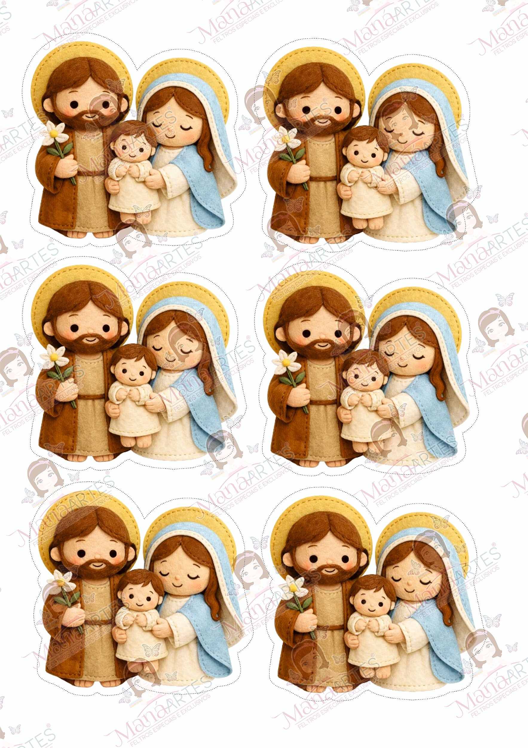 Cada santinho foi ilustrado com cuidado especial, respeitando traços suaves, expressões acolhedoras e uma paleta de cores harmoniosa, perfeita para criar lembrancinhas, chaveiros, enfeites, painéis decorativos e peças cheias de propósito.