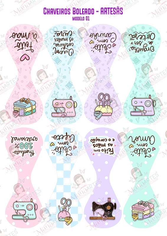 Kit Chaveiros Artesã Candy: contém 08 pingentes sortidos, com frente e verso das peças.
