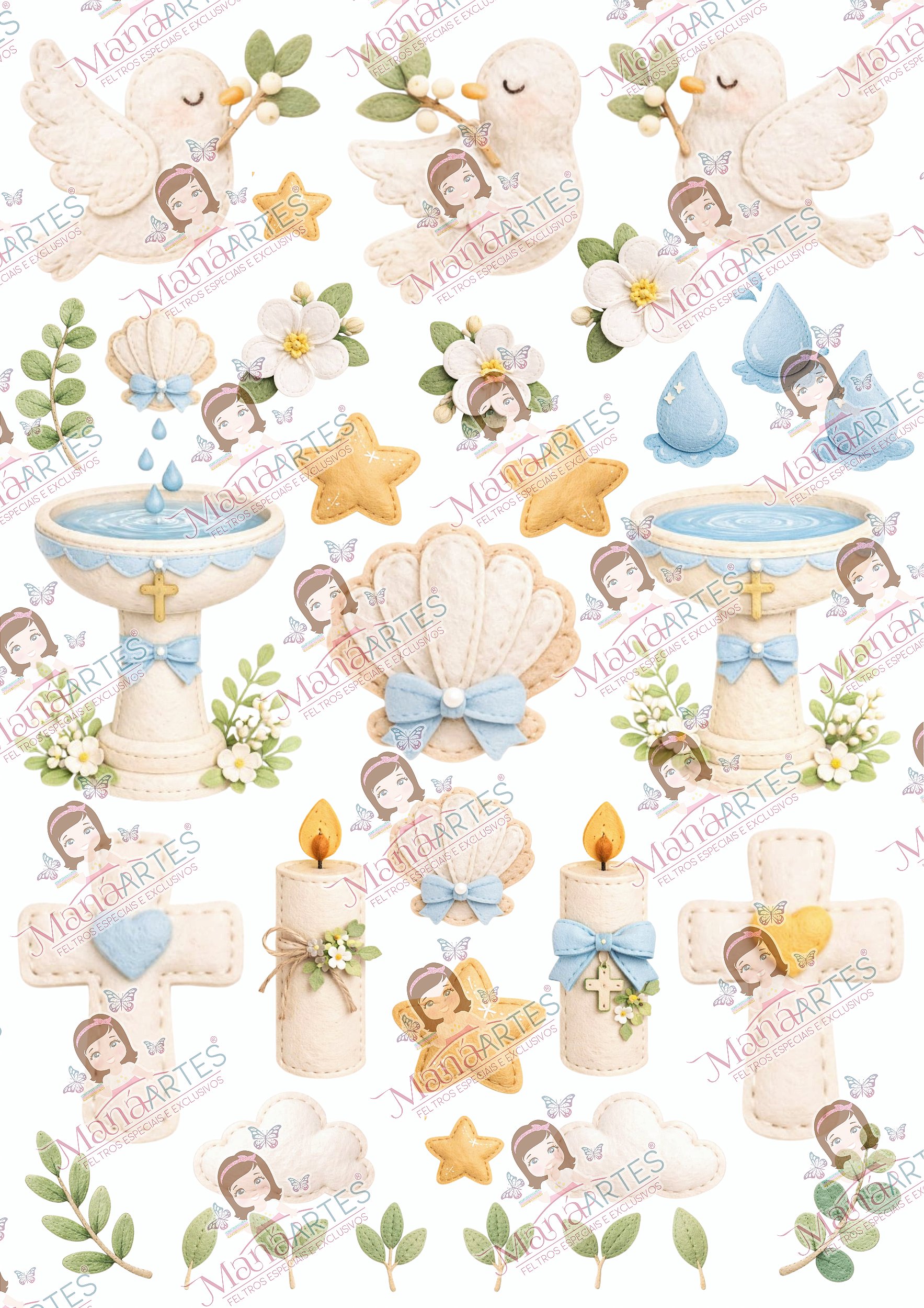 batismo azul, estampa batizado menino, painel batismo feltro, coleção aconchego fé, elementos batismo, pombinha espírito santo, pia batismal, artesanato religioso, feltro estampado, maná artes