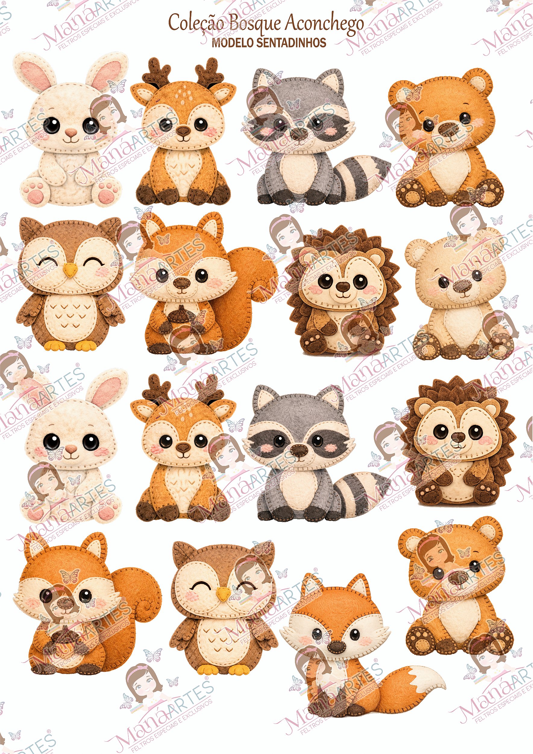 A versão Sentadinhos da Coleção Bosque Aconchego traz os personagens em poses delicadas e acolhedoras, perfeitas para composições mais suaves e afetivas.