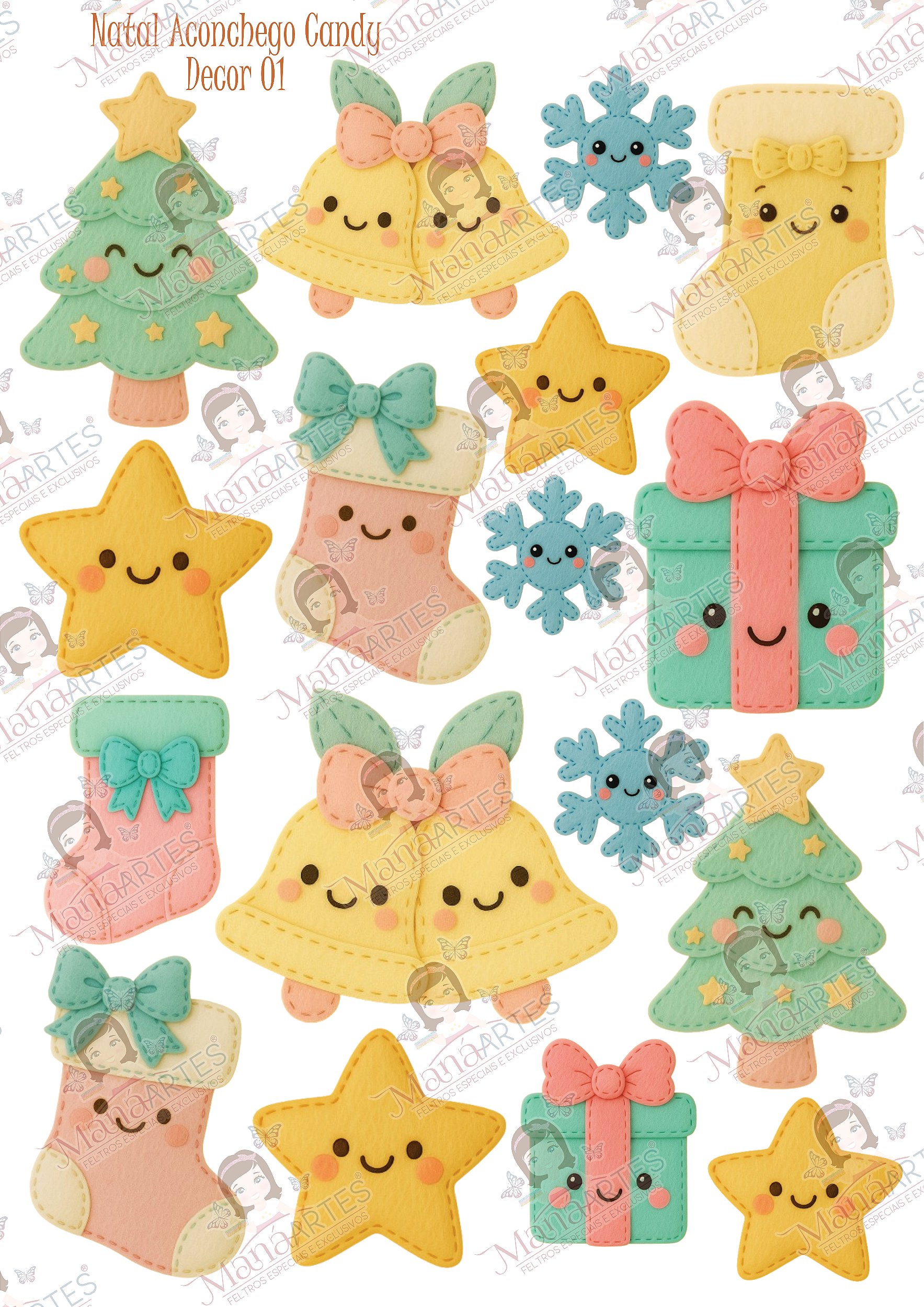 A Candy – Decor 01 traz árvore, sinos, estrelas, meias, presentes e floquinhos no combo candy color (menta, rosinha, pêssego e amarelinho) com costuradinho Maná. É abrir o painel, recortar e decorar guirlandas, tags, laços, topo de bolo/árvore e lembrancinhas. Natal leve, fofo e fotogênico — pronto pra brilhar no feed e na porta de casa. 🎄🎀