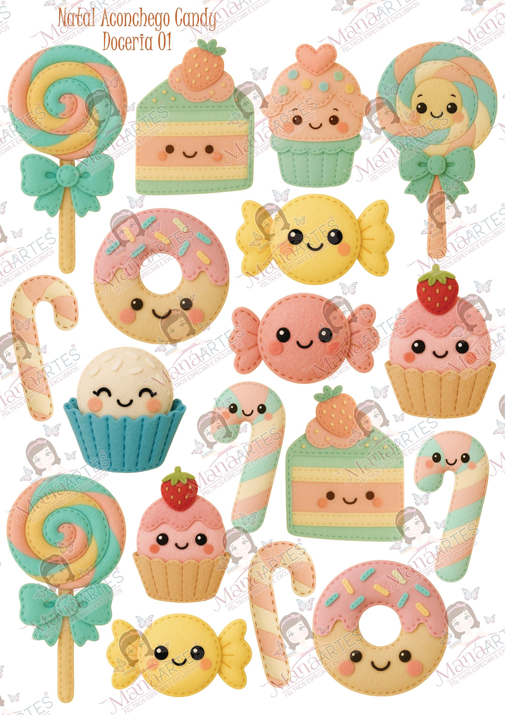 A Doceria 01 traz pirulitos espiral, donuts, cupcakes, fatias de bolo, balinhas, bengalas e brigadeirinho em candy color (menta, pêssego, rosinha e amarelinho) com costuradinho Maná. Abre o painel, recorta e adoça guirlandas, topos, tags, embalagens e a árvore inteira. Natal leve, fotogênico e zero perrengue. 🎄🍰