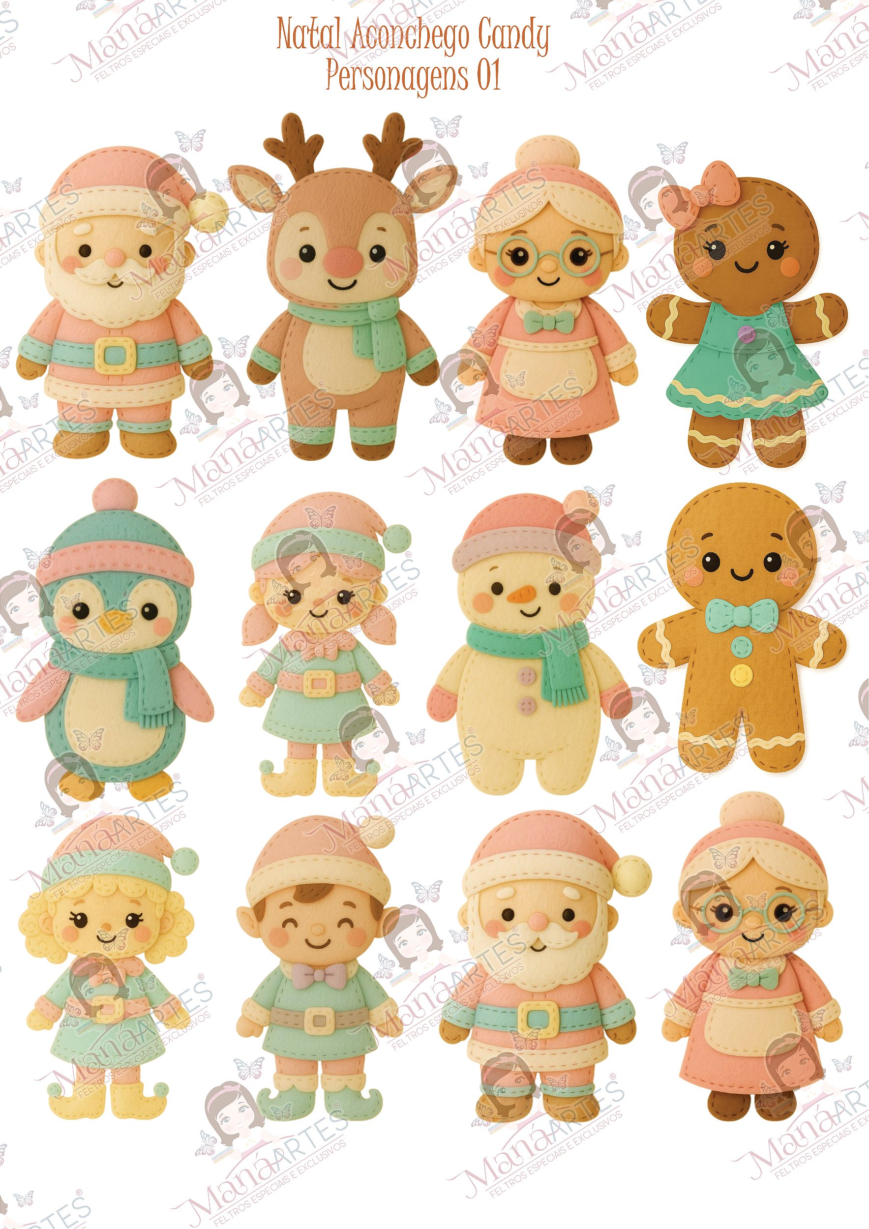 O painel Personagens 01 traz a turma candy com costuradinho Maná: Papai Noel, Mamãe Noel, Rena, Elfos, Ginger Girl & Ginger Boy, Pinguim e Boneco de Neve. Fofos, proporcionais e prontos para guirlandas, topos, mobiles, lembrancinhas, quiet book e pingentes de árvore. É abrir, recortar e arrasar na produção. 🎄💛
