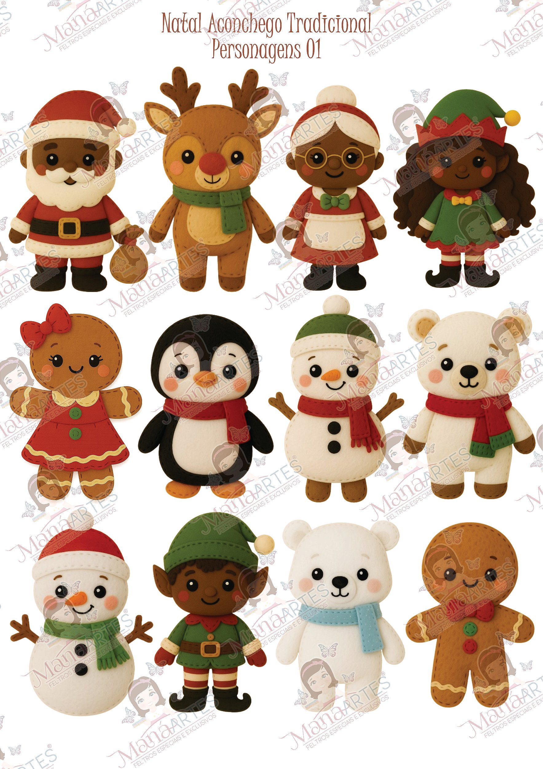 O painel Personagens 01 traz a turma completa em feltro com costuradinho Maná: Papai Noel, Mamãe Noel, Rena, Elfo, Ginger Girl & Ginger Boy, Pinguim, Ursinho Polar e Bonecos de Neve. Fofos, proporcionais e prontos para guirlandas, topos de bolo, mobiles, lembrancinhas, quiet book e decoração de árvore. É só recortar e brilhar na sua produção. 💫