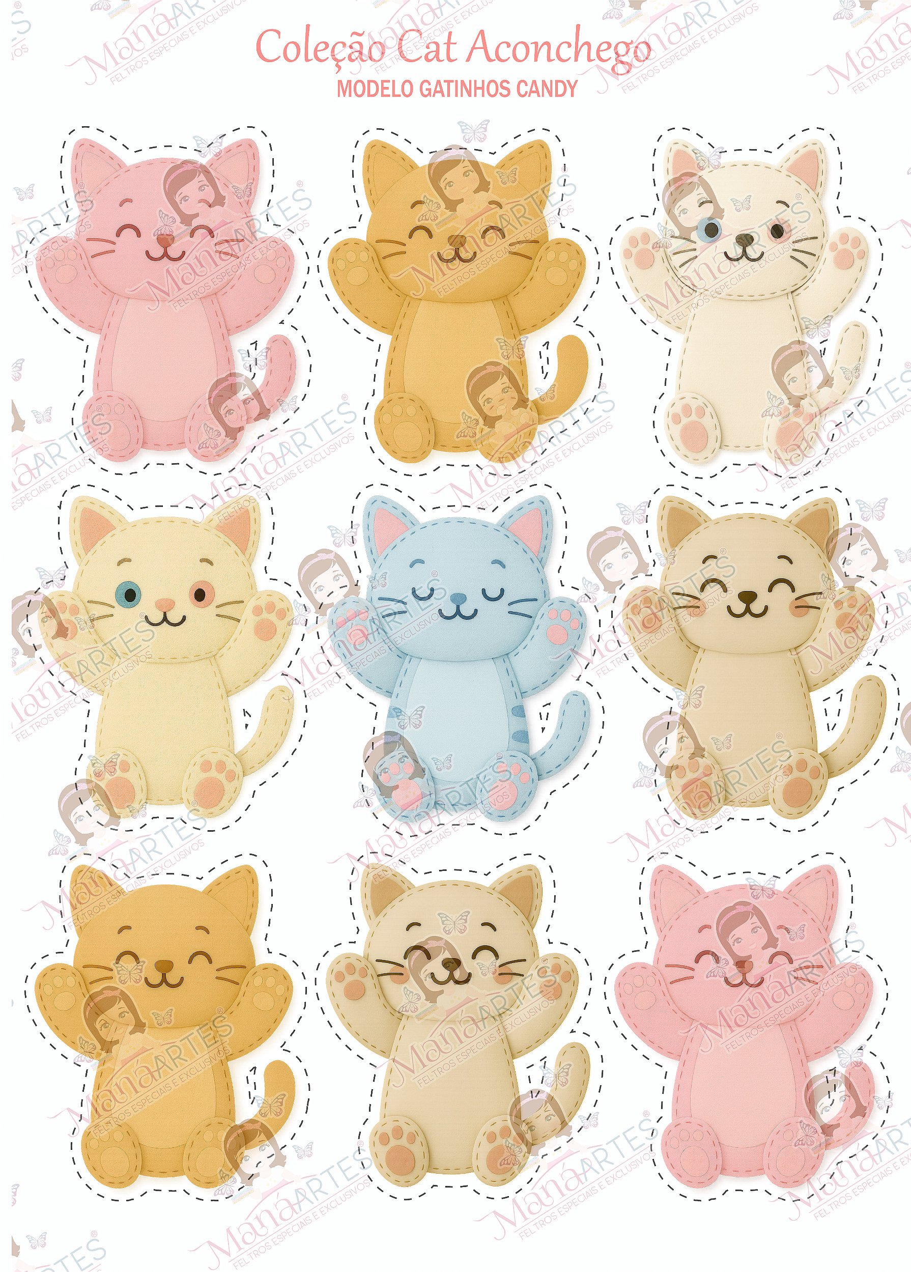 Coleção de gatinhos coordenados, cada um com contorno próprio para recortar limpo.