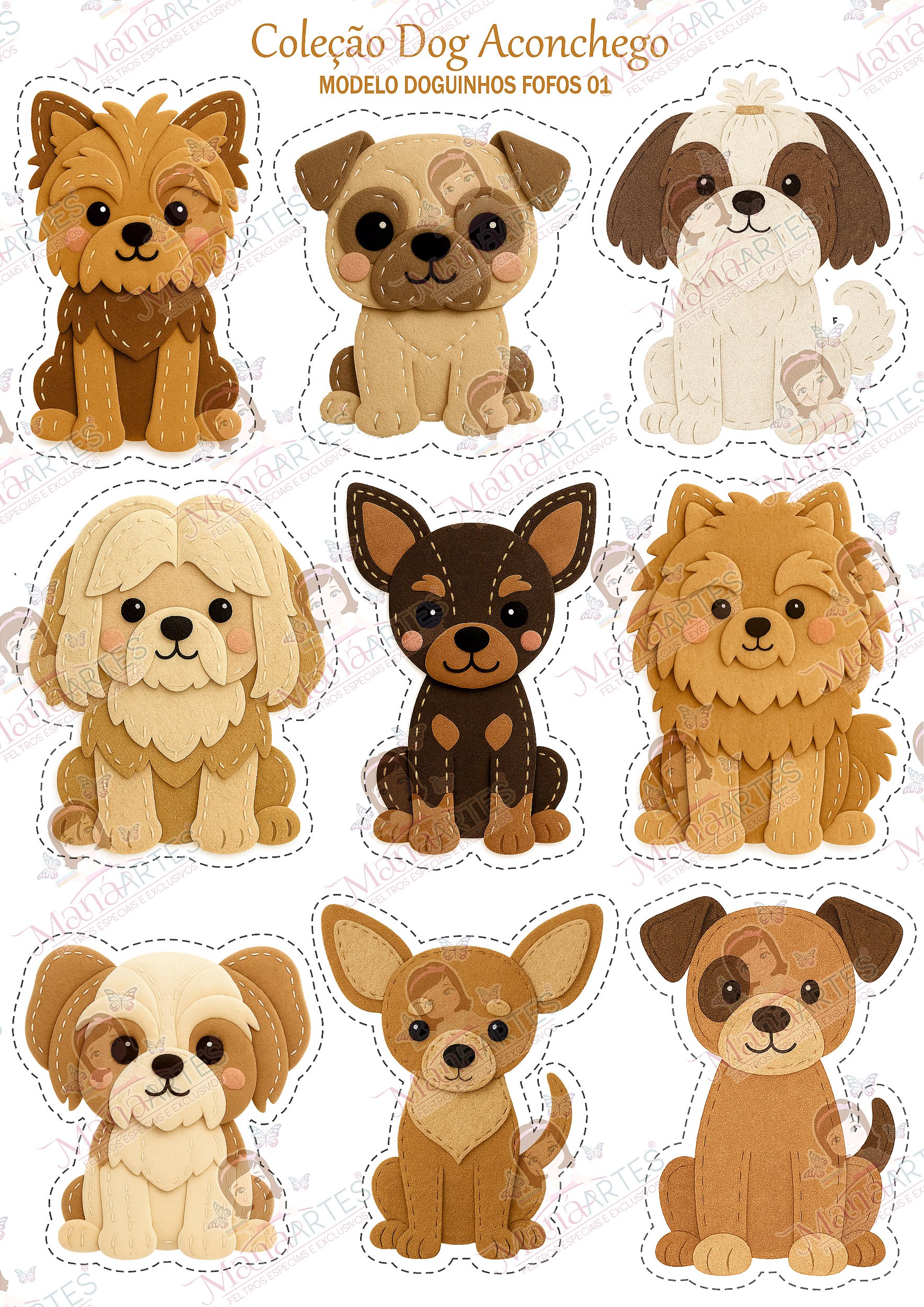 Coleção de doguinhos coordenados, cada um com contorno individual para recorte.