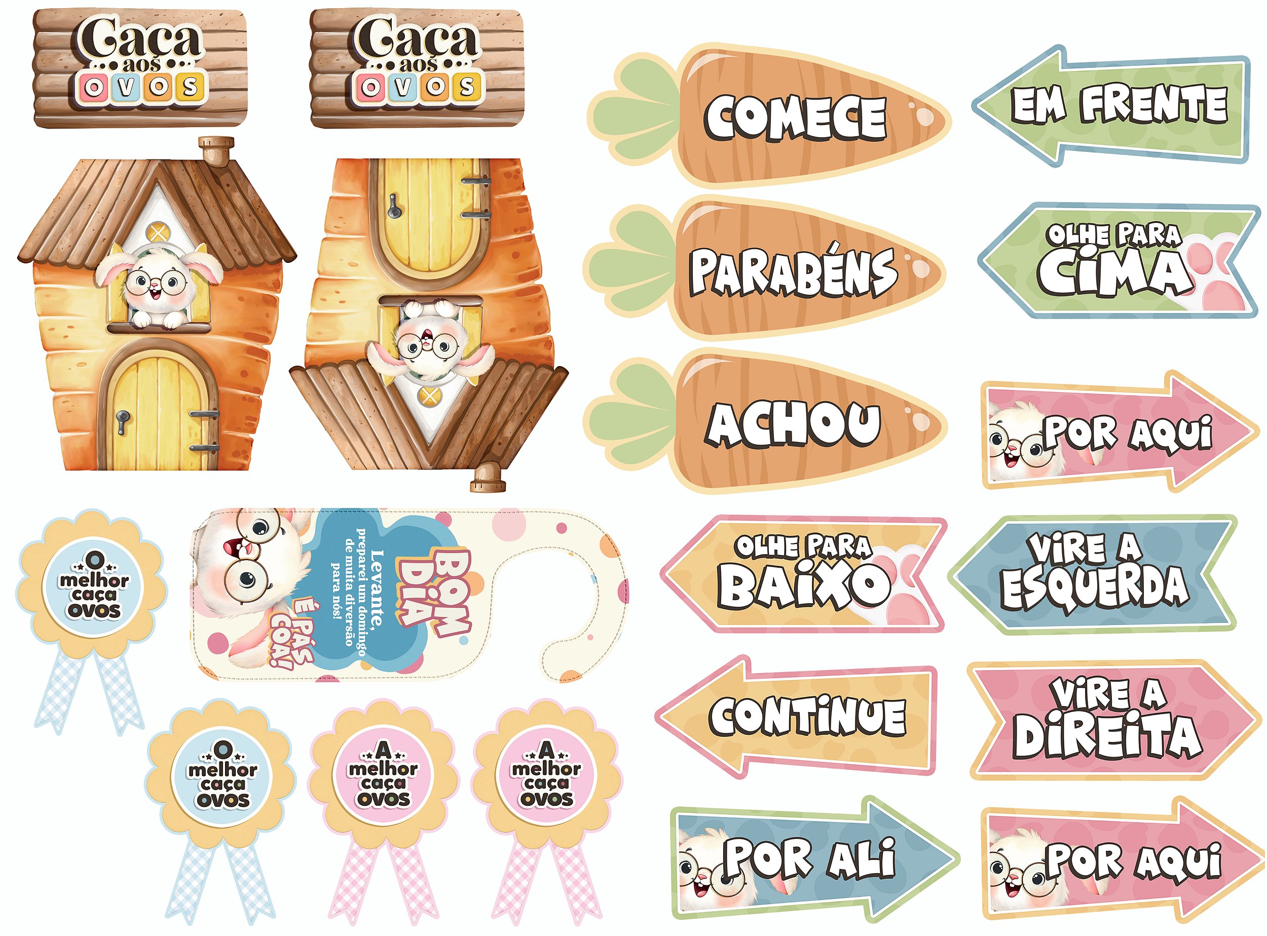 Recorte os elementos, aplique em feltro ou utilize diretamente em projetos criativos. Combine com cordões, cestinhas e pegadinhas pelo ambiente para criar um verdadeiro caminho mágico do coelhinho da Páscoa.