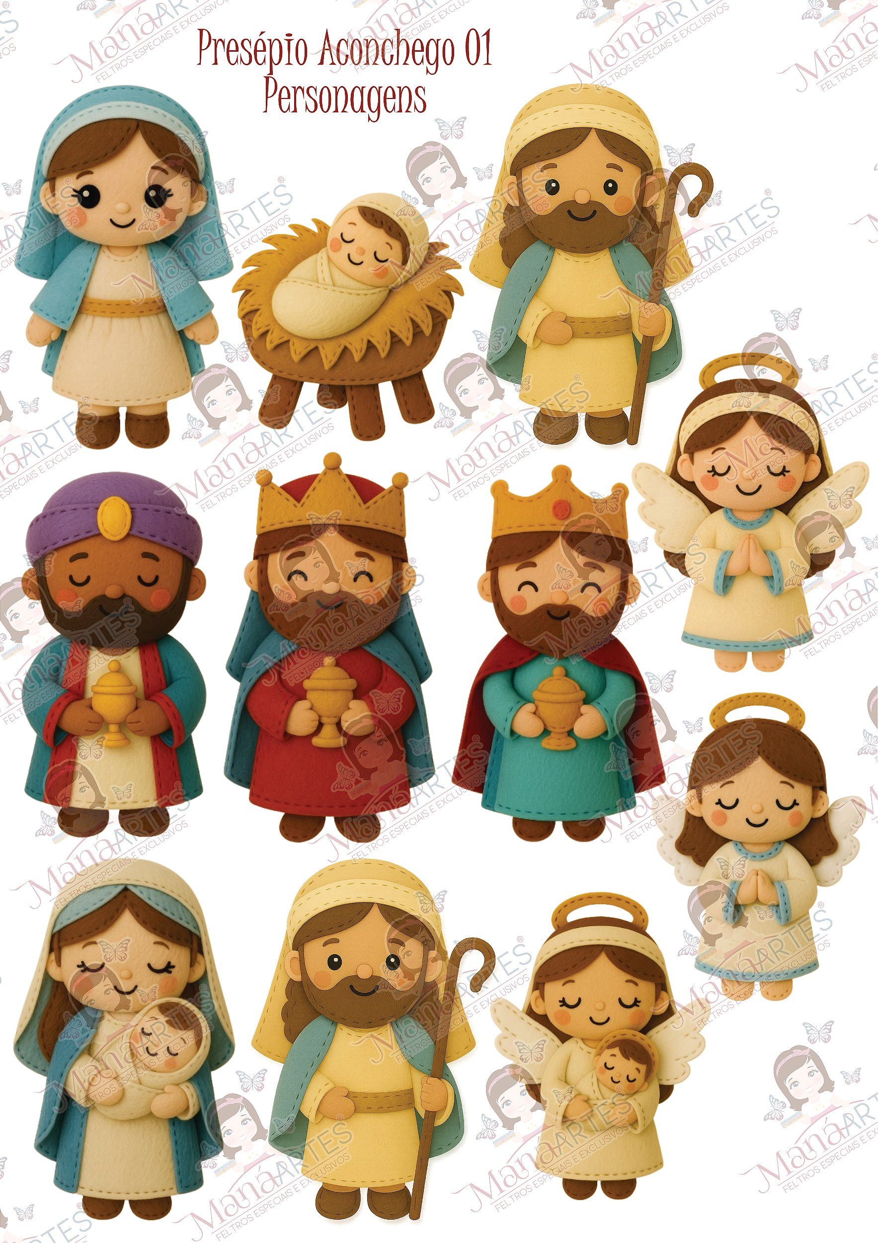 Vem Maria, José, Menino Jesus, Anjos e os Três Reis Magos (ouro, incenso e mirra), todos com costuradinho e carinhas serenas. Tamanhos perfeitos para guirlandas, nichos, topo de bolo/árvore e cenários catequéticos. Abriu, recortou, montou: Natal montado em minutos.